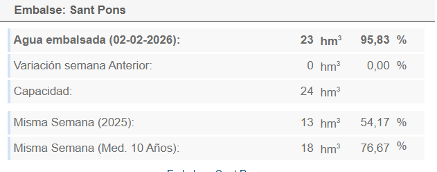 Aquest volum representa un 95,83 % d’ocupació, una xifra excepcionalment alta que situa Sant Ponç entre els embassaments amb més reserves de les conques internes de Catalunya. A més, el nivell actual és molt superior al registrat fa un any en les mateixes dates, quan se situava al voltant del 54 %, i també per sobre de la mitjana dels darrers deu anys, que és del 76,67 %.