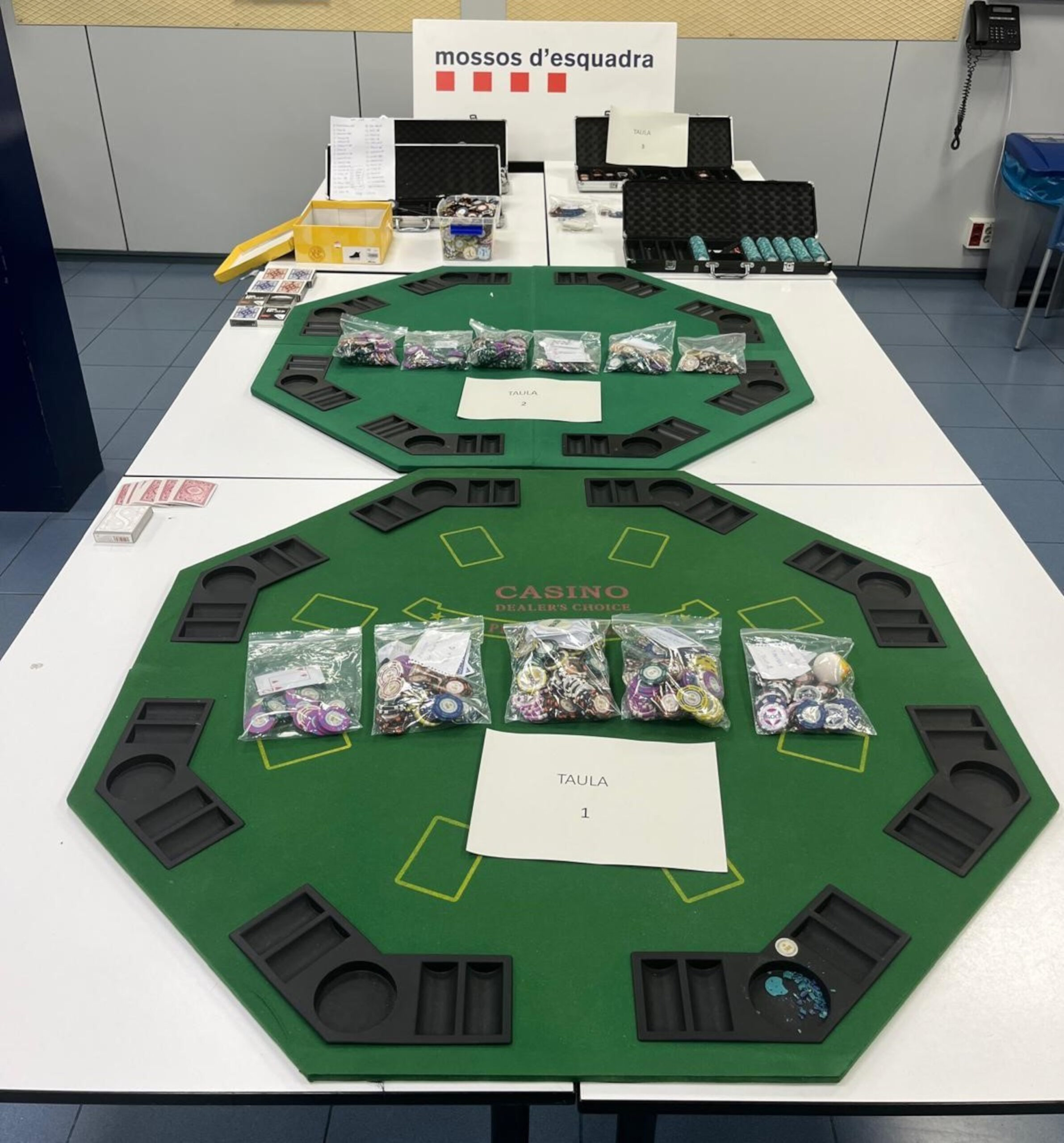 ACN Manresa – Els Mossos han denunciat 22 persones per participar en partides il·legals de pòquer en un restaurant de Sant Fruitós de Bages. Els fets van passar la nit del 27 de desembre, quan la policia va tenir coneixement que al local, que es trobava tancat al públic, s’hi estaven disputant partides de joc il·legal. Cap a la mitjanit, diverses patrulles es van desplaçar fins al local i van observar moviments sospitosos de persones que entraven i sortien mentre pujaven i abaixaven la persiana. Agents dels Mossos van accedir al restaurant i, a la zona més interior del local, van localitzar tres taules separades, amb entre cinc i sis persones, que estaven jugant al pòquer amb fitxes, cartes i tapets de joc. També es van intervenir 630 euros en efectiu.