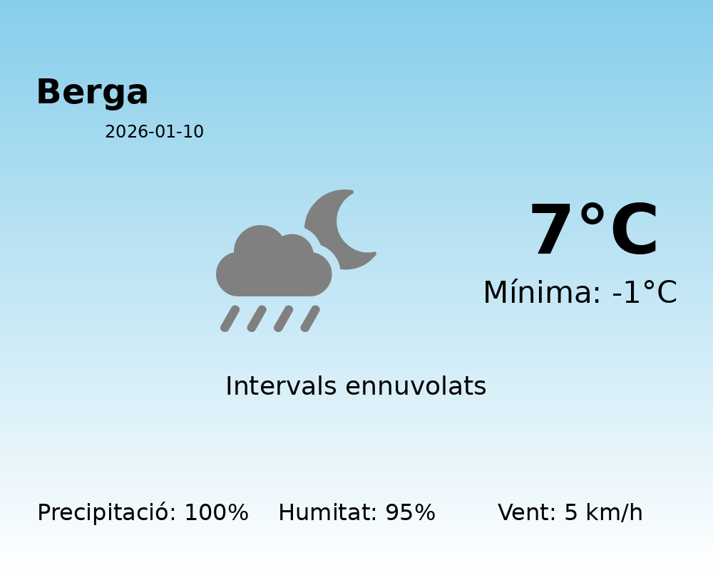 En resum, l’hivern fa més que acte de presència avui a Berga. Recomanem utilitzar capes de roba adequades per al fred, portar impermeables i estar preparats per a les pluges persistents. Mantingueu-vos al corrent de les actualitzacions meteorològiques per a qualsevol canvi en la predicció.