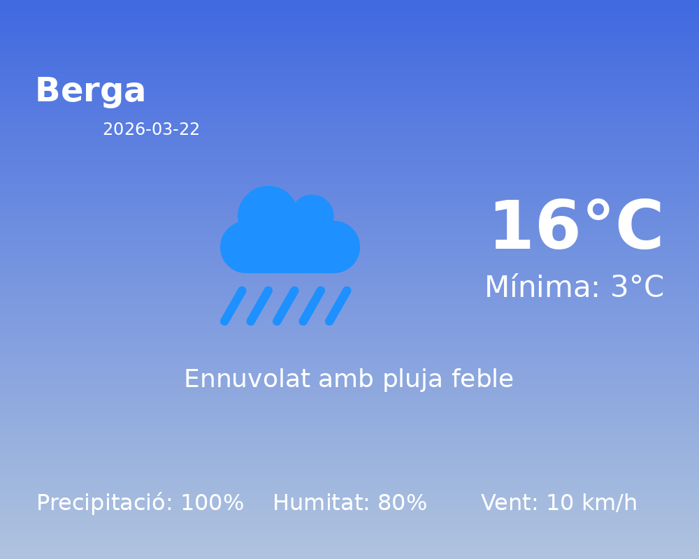 En resum, la jornada a Berga serà marcada per pluges i núvols abundants amb temperatures fresques. És recomanable adaptar l’elecció de la roba a aquestes condicions i planificar les activitats a l’exterior tenint en compte les pluges.