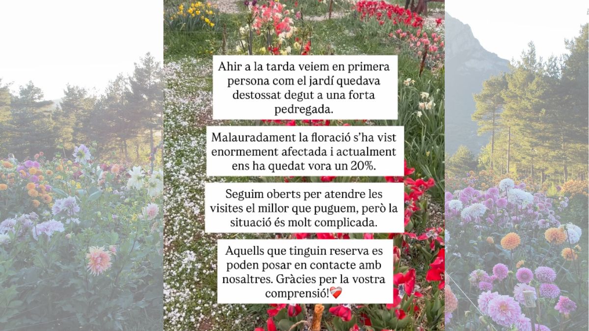Segons han explicat des de l’organització, la calamarsa va impactar amb gran intensitat sobre el jardí, destrossant bona part de les tulipes en plena floració. “Ahir a la tarda vèiem en primera persona com el jardí quedava destrossat degut a una forta pedregada”, han relatat en un comunicat, visiblement afectats per la situació.
