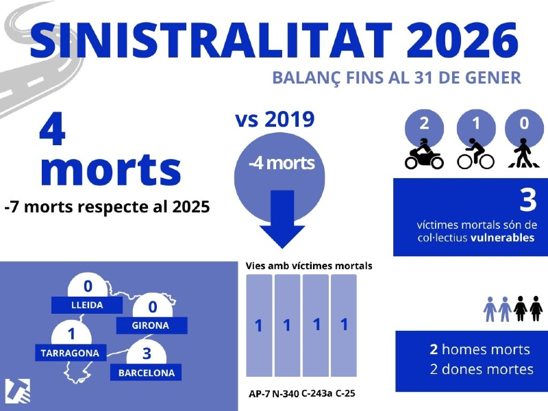 El Servei Català de Trànsit (SCT) informa que durant el mes de gener de 2026, es van registrar 4 víctimes mortals en accidents a les carreteres interurbanes de Catalunya, una disminució significativa respecte al mateix període de l’any anterior, quan hi van haver 11 morts. Així doncs, aquest any han perdut la vida 7 persones menys en comparació amb el gener de 2025.
